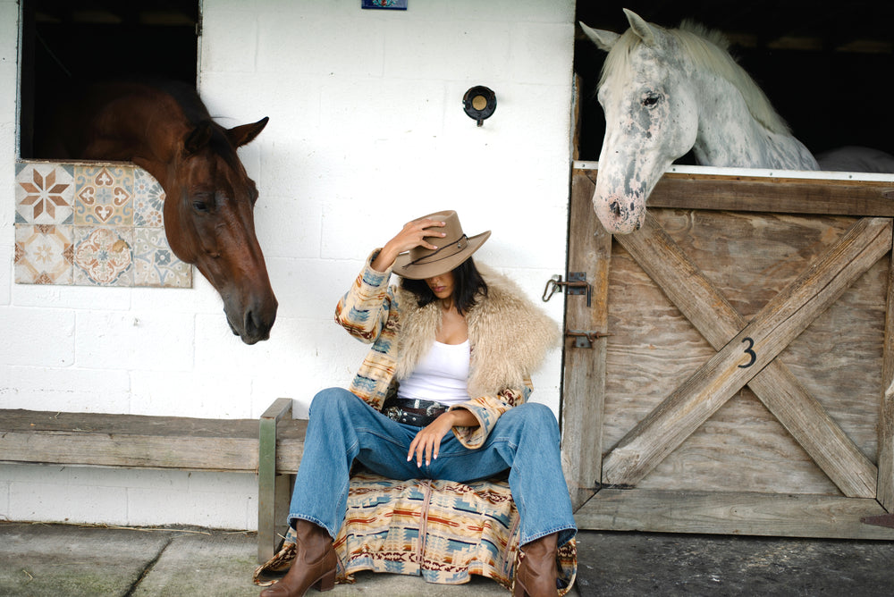 Rooted in sun and silence, a tribute to the wild beauty of desert horizons Hand-blocked western weight felt in bone, featuring hand-etched cactus detailing and a natural polished stone trim that mirrors the hues of desert sand and sunlight Designed...
