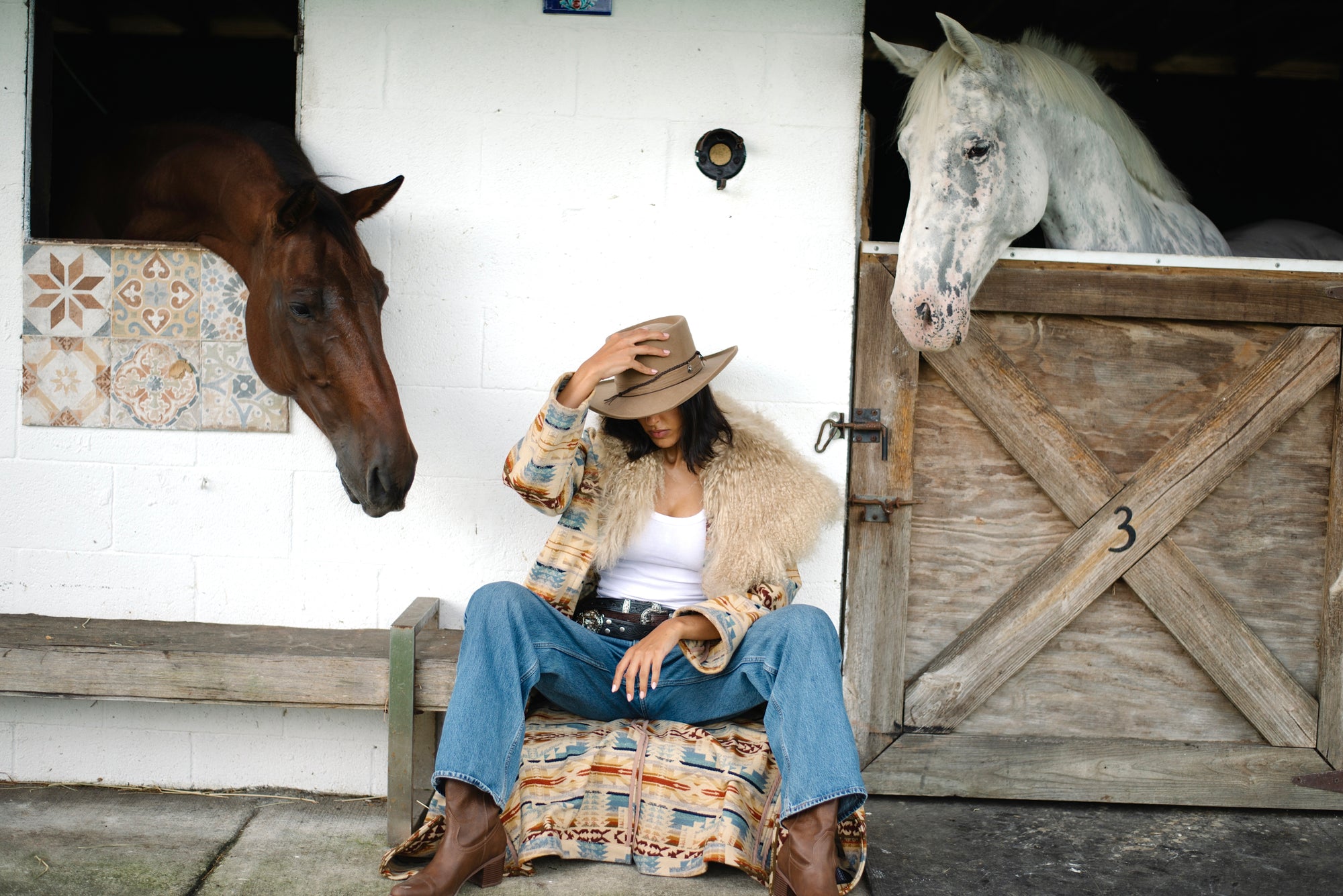 A story woven in symbols; protection, fortune, and desert soul captured in one timeless piece. Western felt hat in onyx, featuring a black bandana trim layered with a leather band adorned with silver conchos, natural pearls, and a gold-plated charm pin...