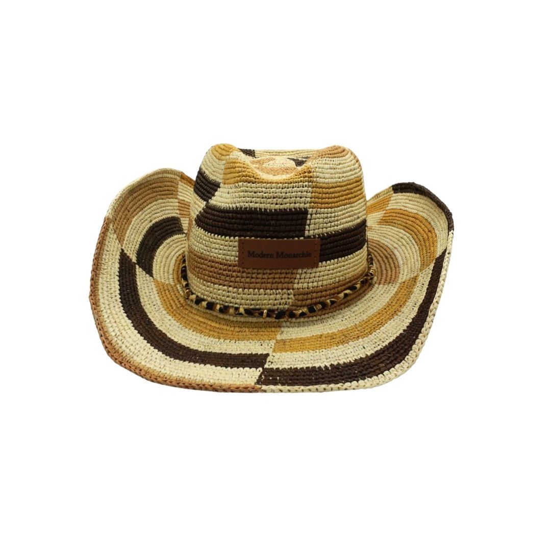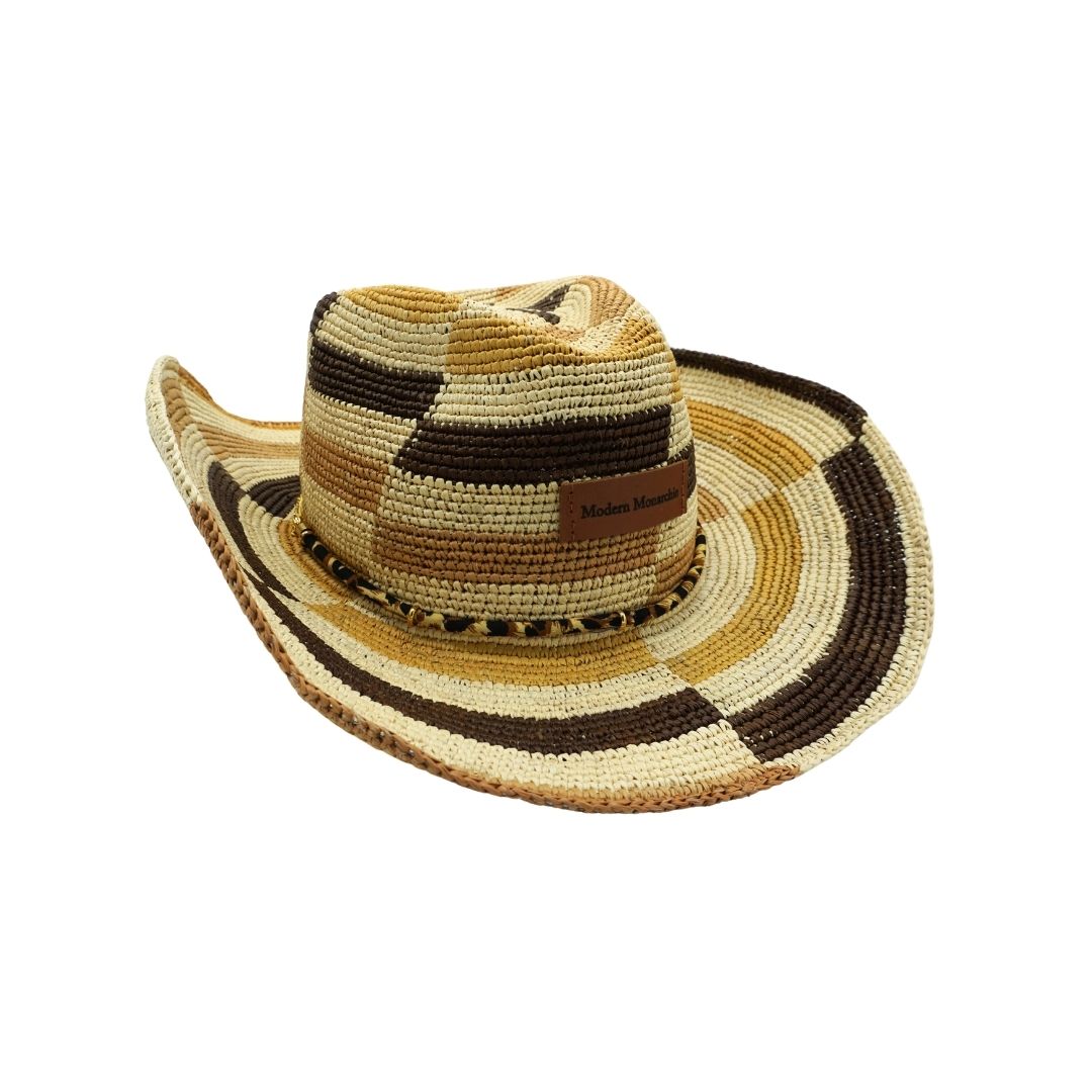 Hand-woven crochet Panama hat with a striped weave in camel, sandstone, and chocolate tones, finished with an animal-print band and gold-plated charms