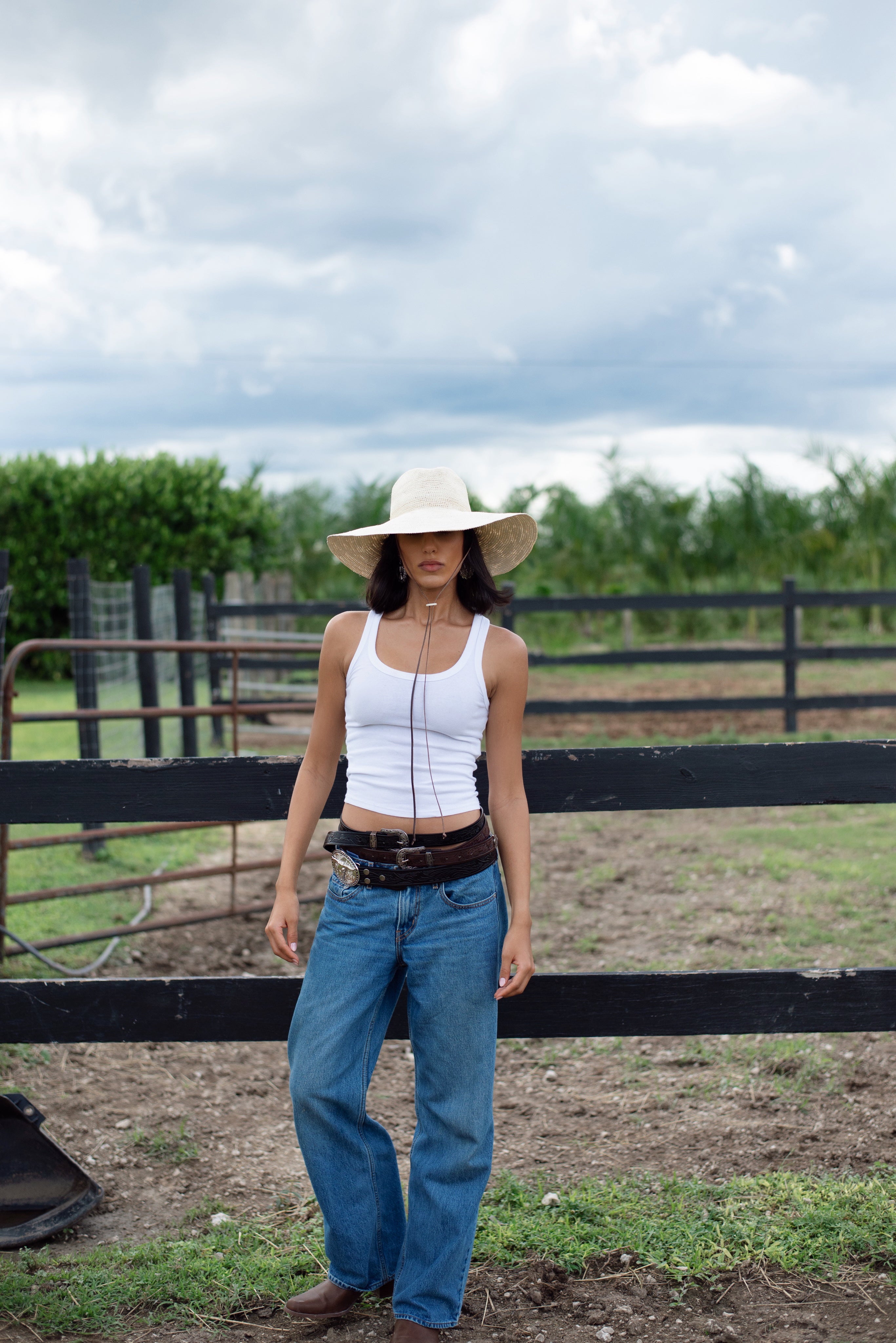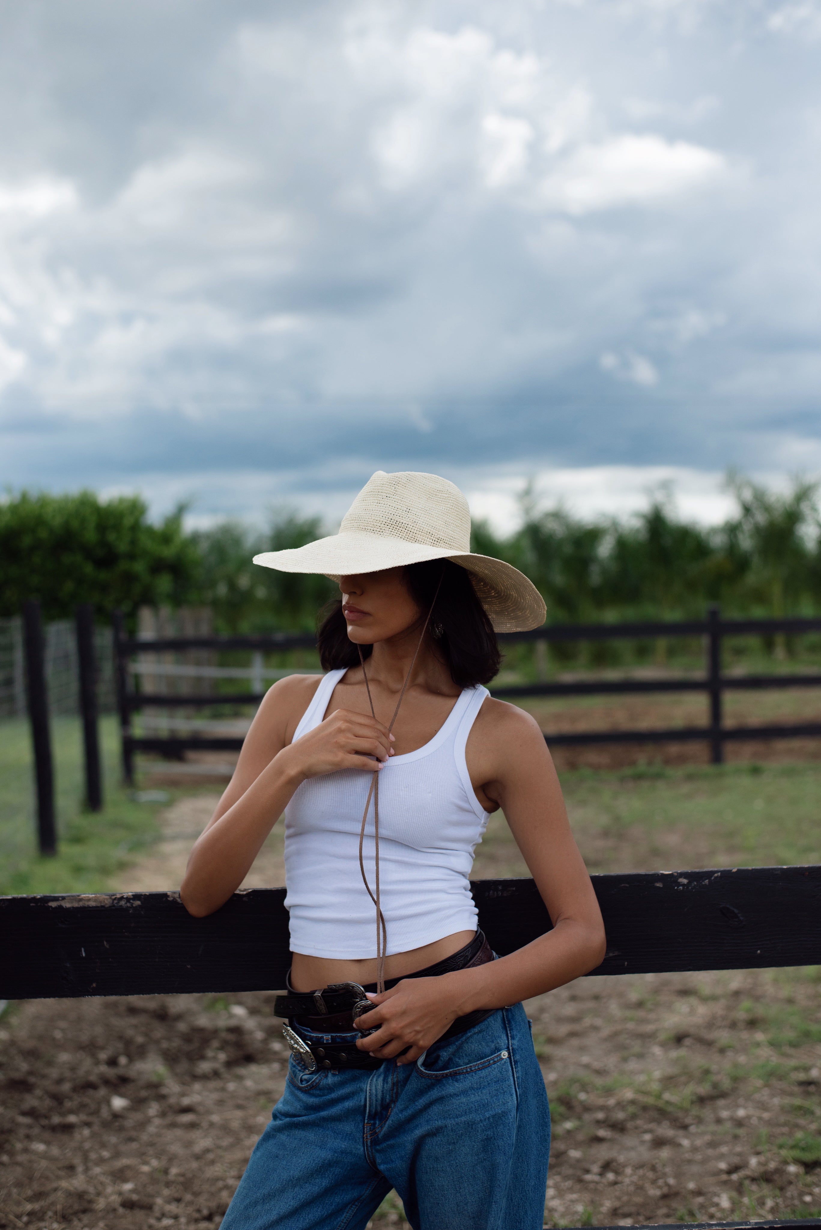 Handwoven Panama straw in sandstone with an adjustable chin strap and a wide brim designed for elevated sun protection