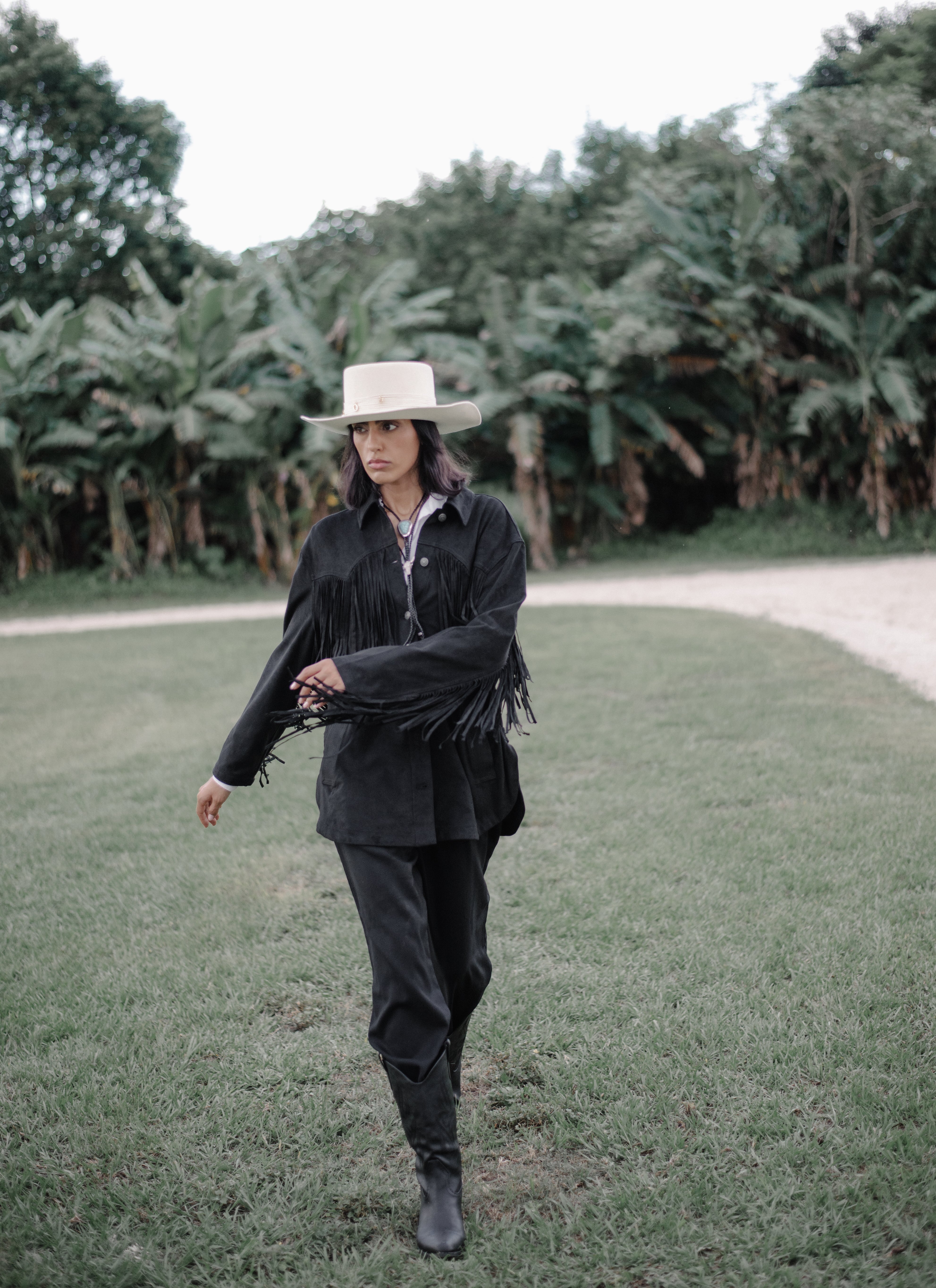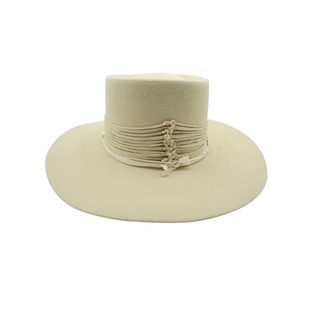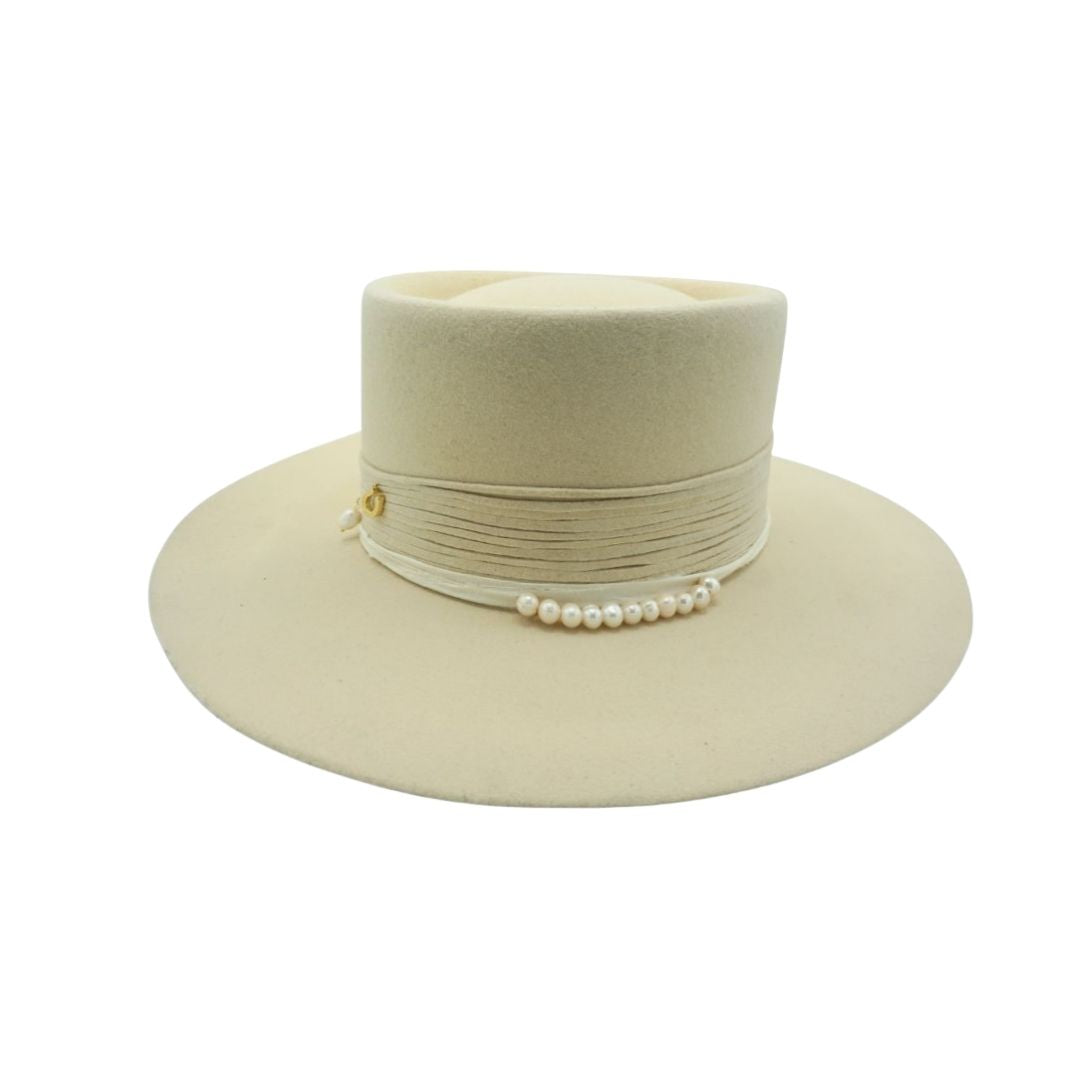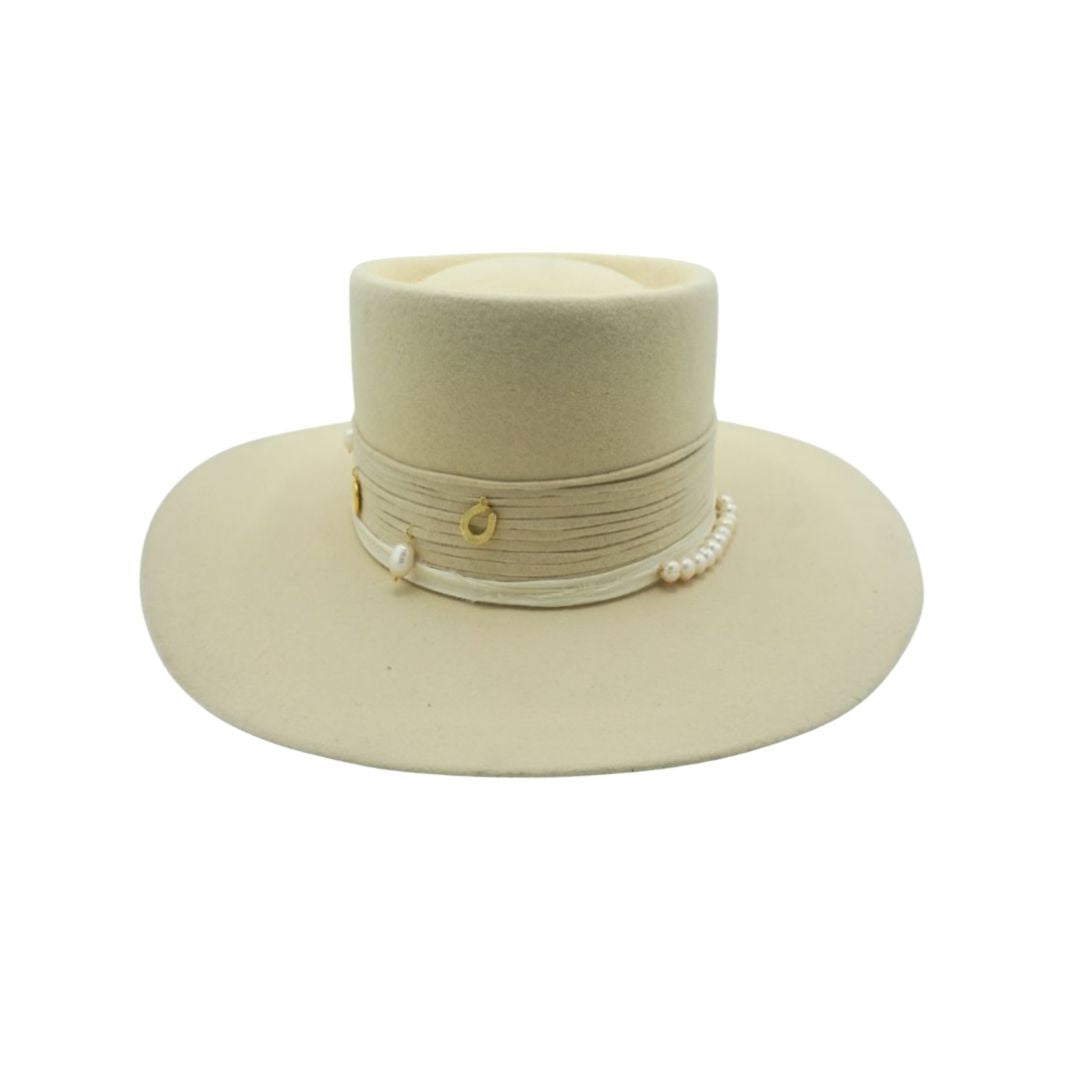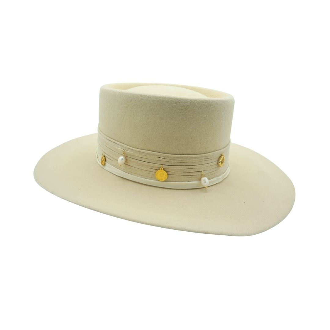 Felt bolero in bone with wrapped leather band, adorned with scattered gold-plated charms and natural pearls for a touch of effortless elegance