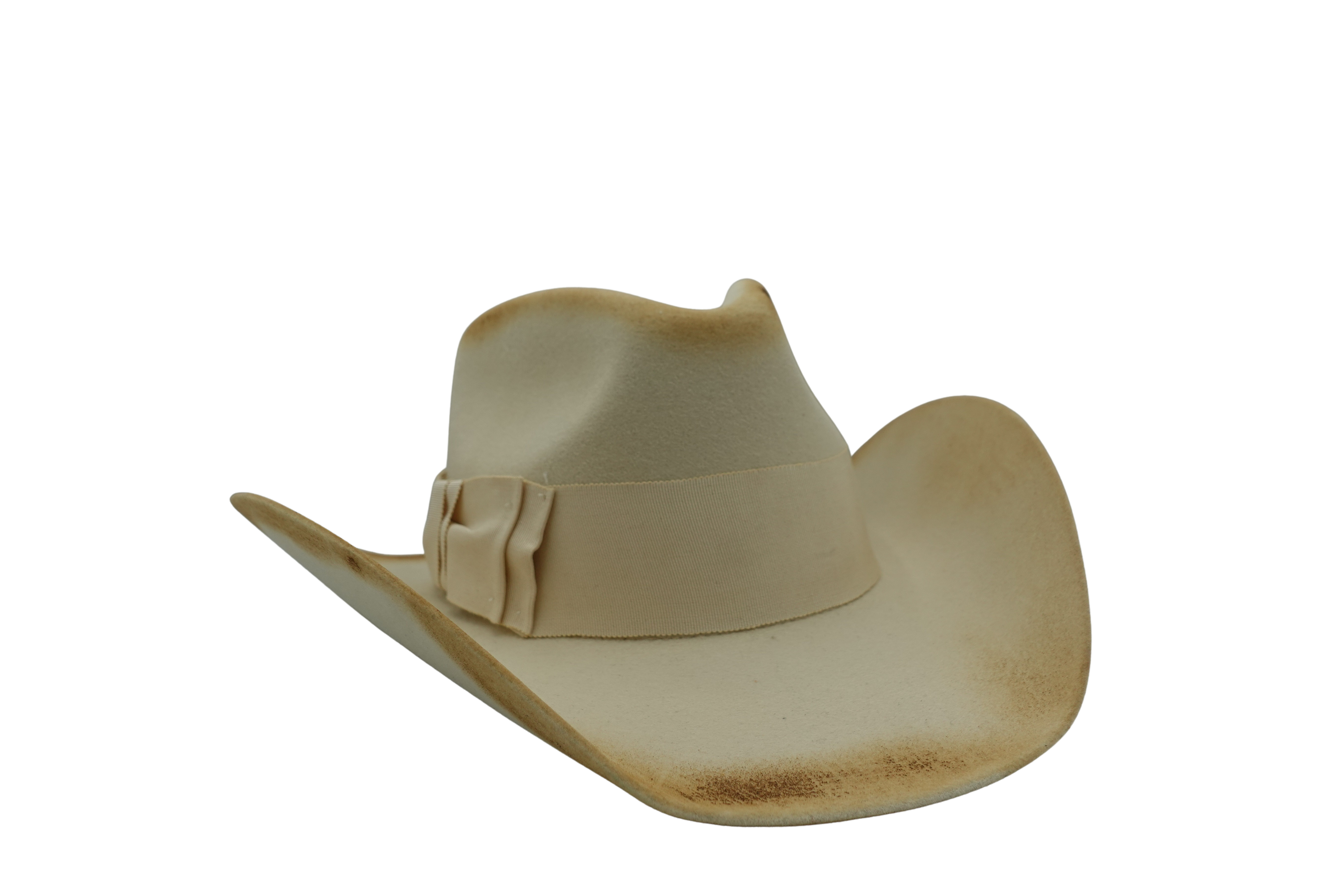 Hand-blocked western weight felt in bone, featuring distressed edges that echo natural desert wear and a tonal grosgrain trim for refined contrast