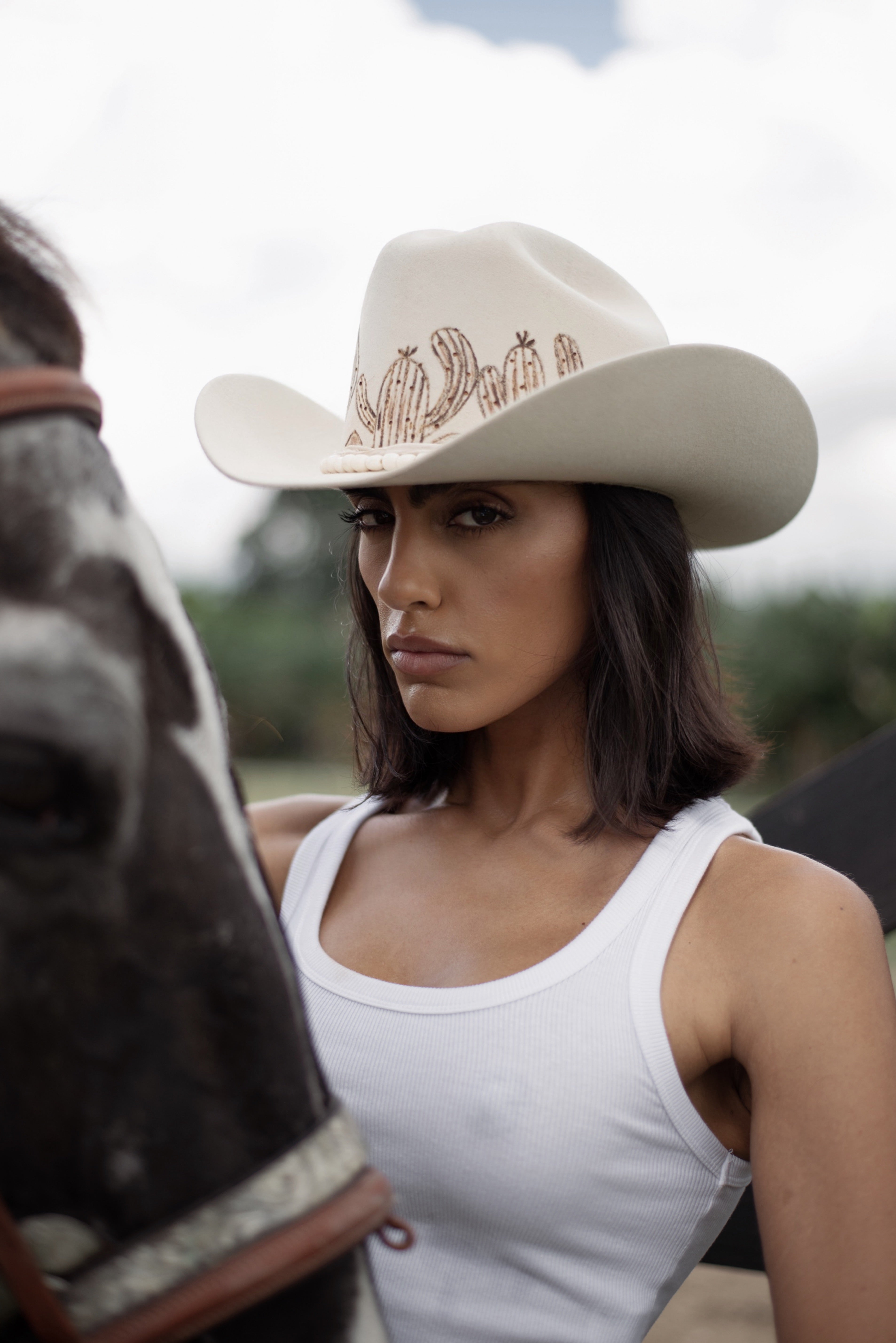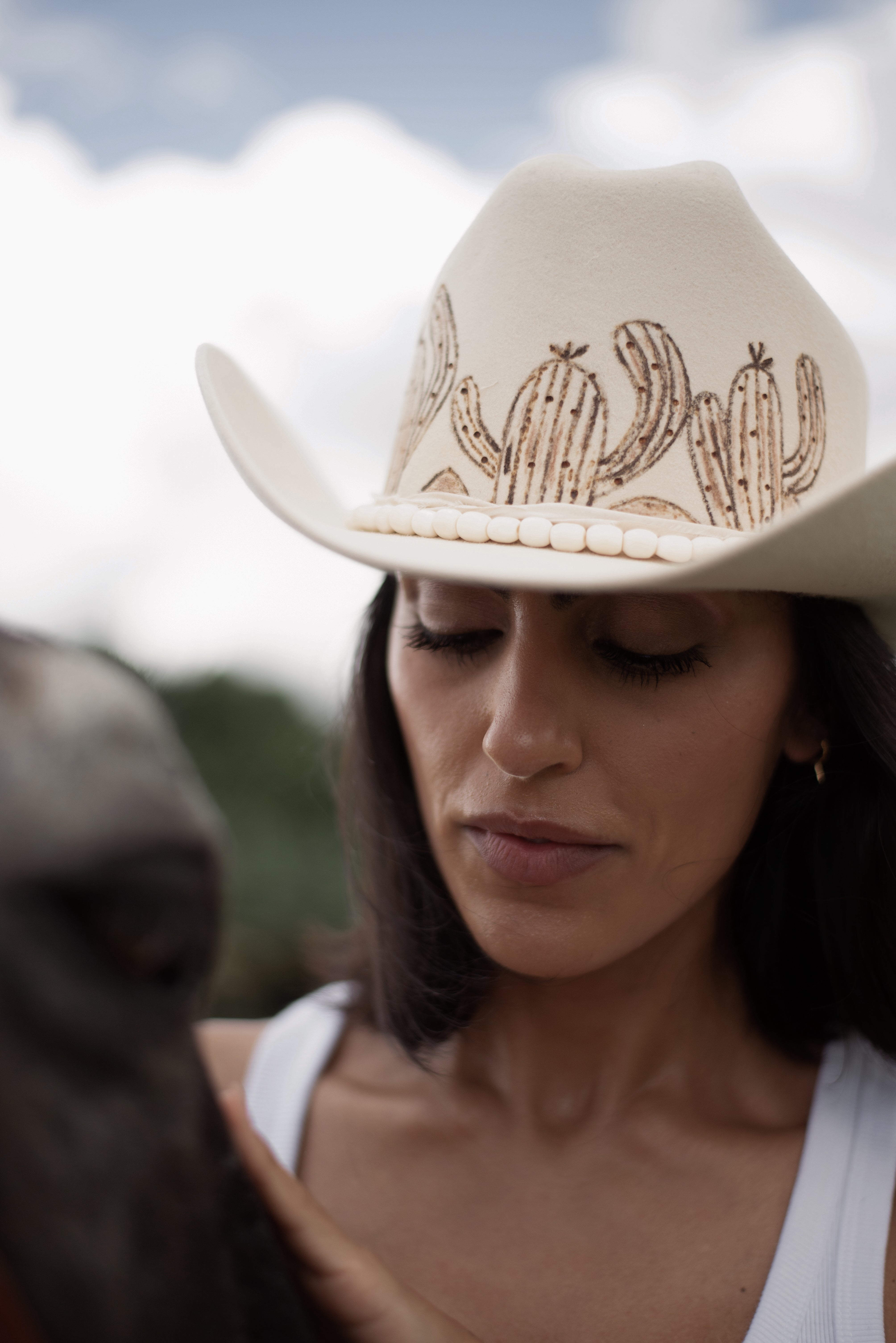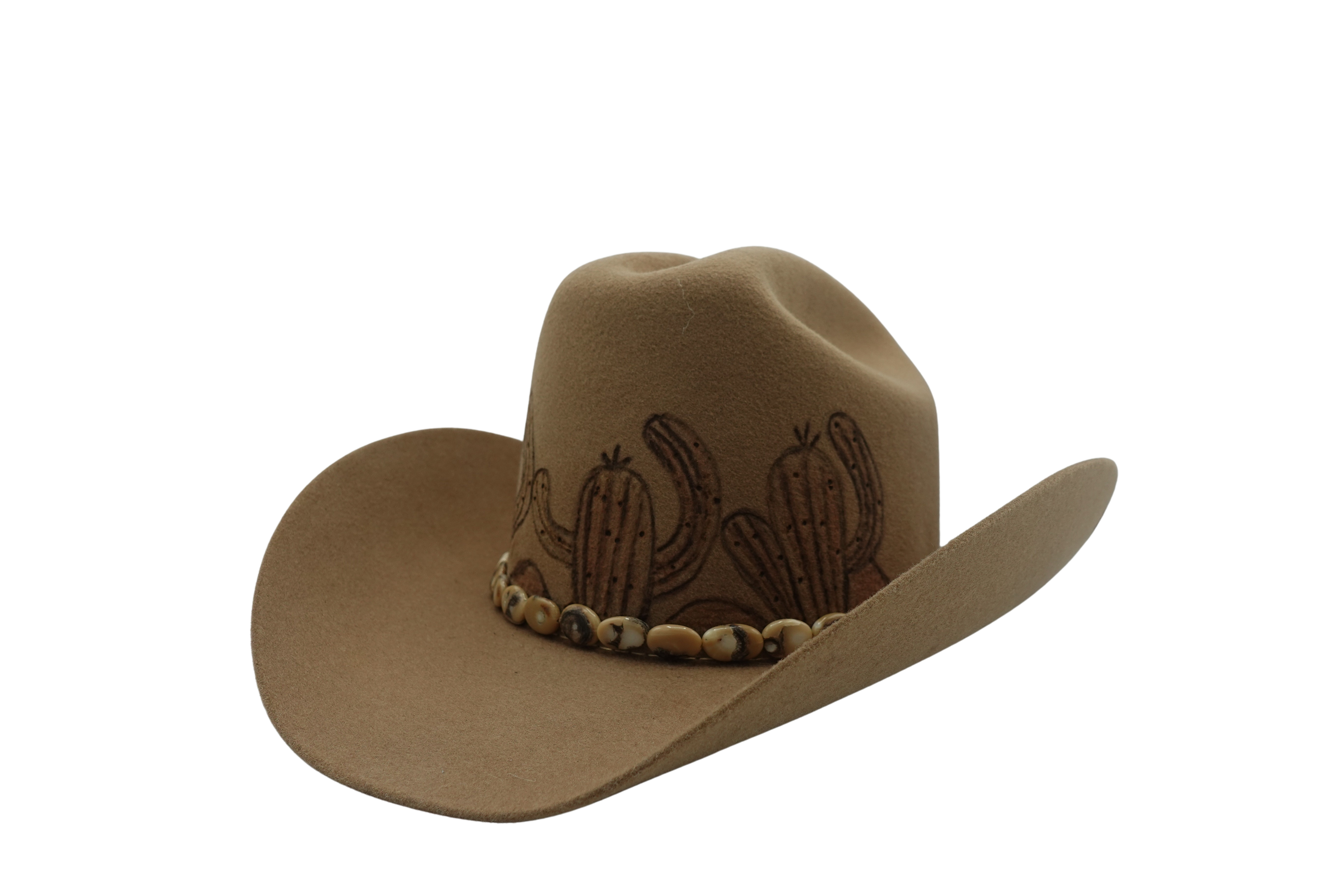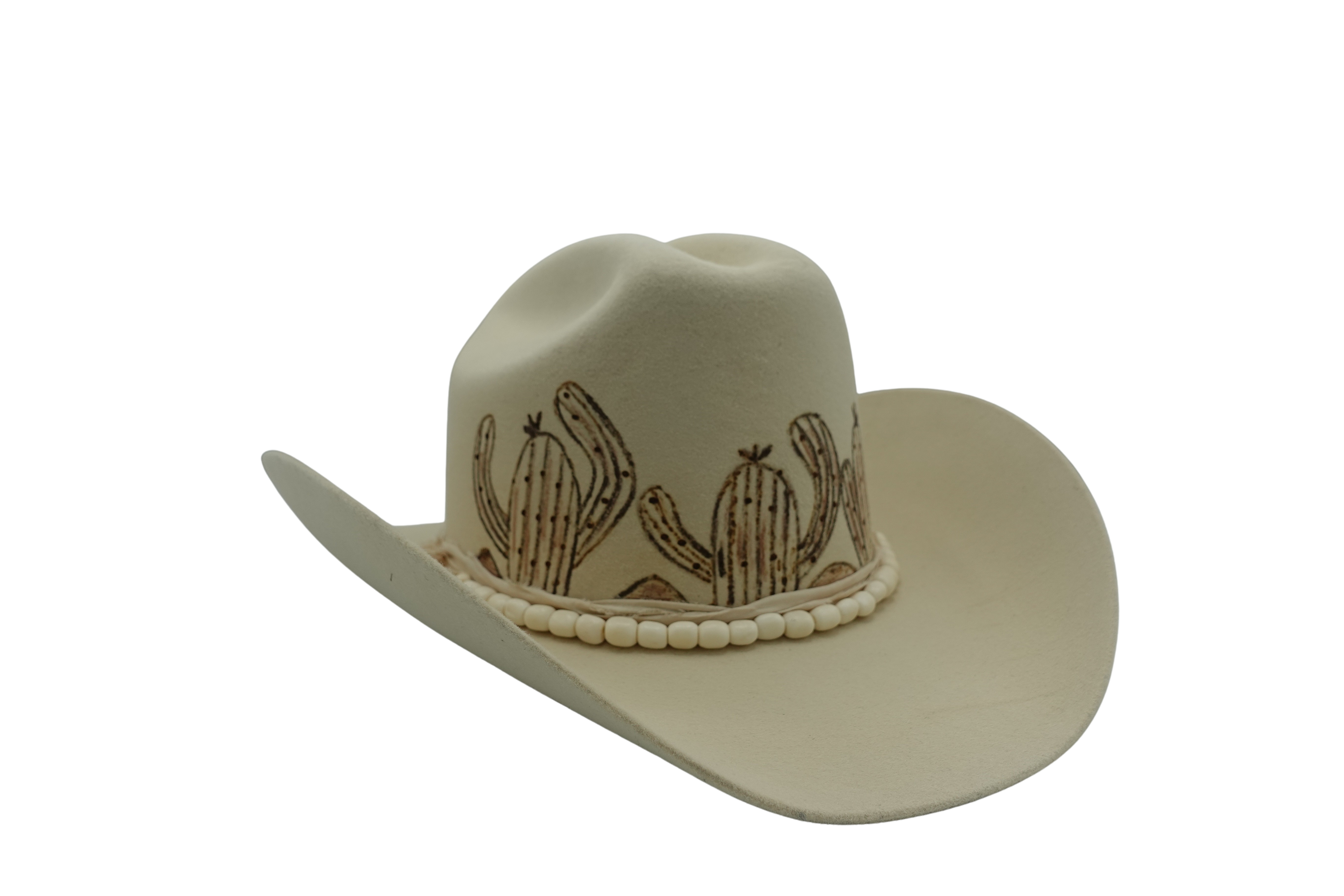 Hand-blocked western weight felt in bone, featuring hand-etched cactus detailing and a natural polished stone trim that mirrors the hues of desert sand and sunlight