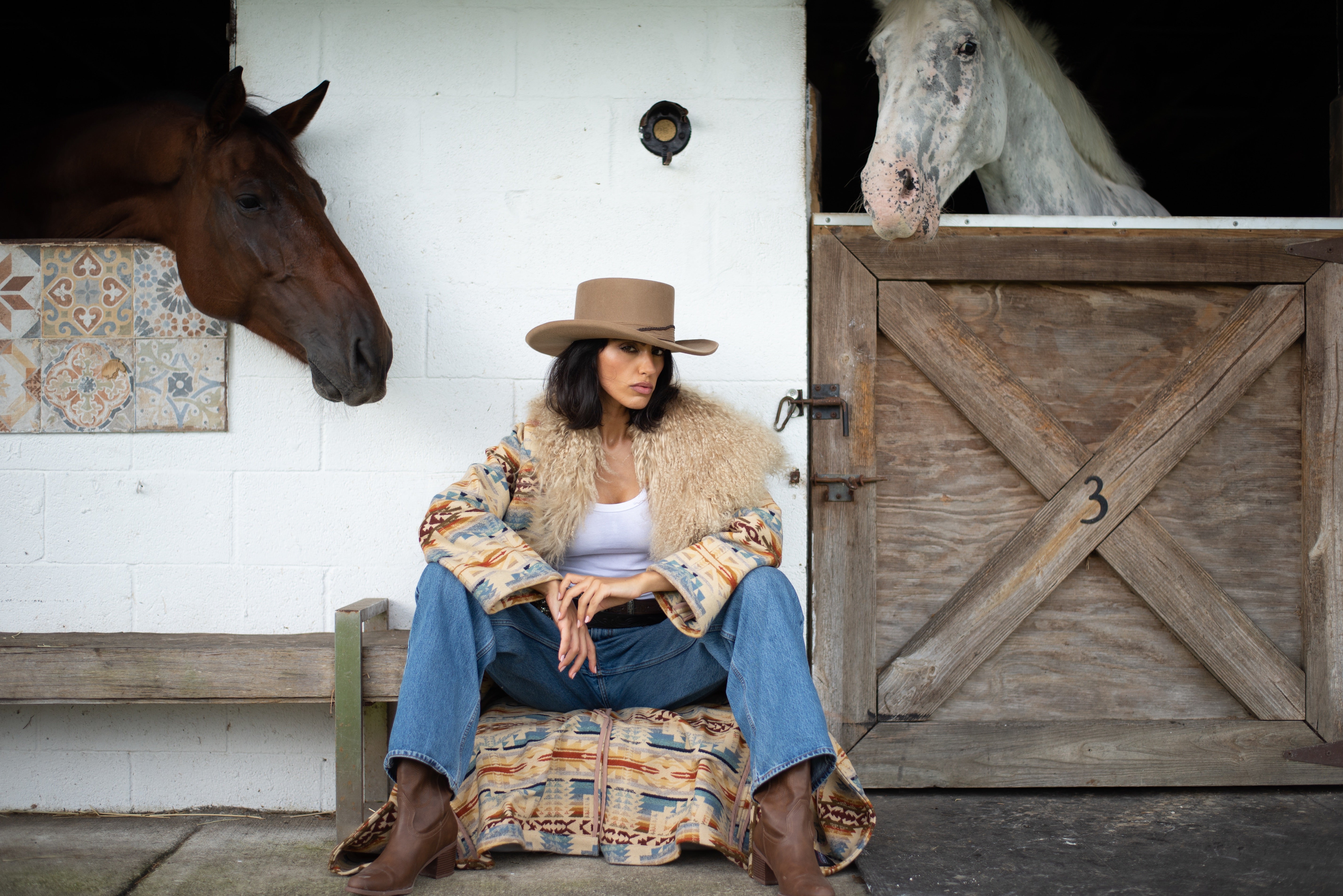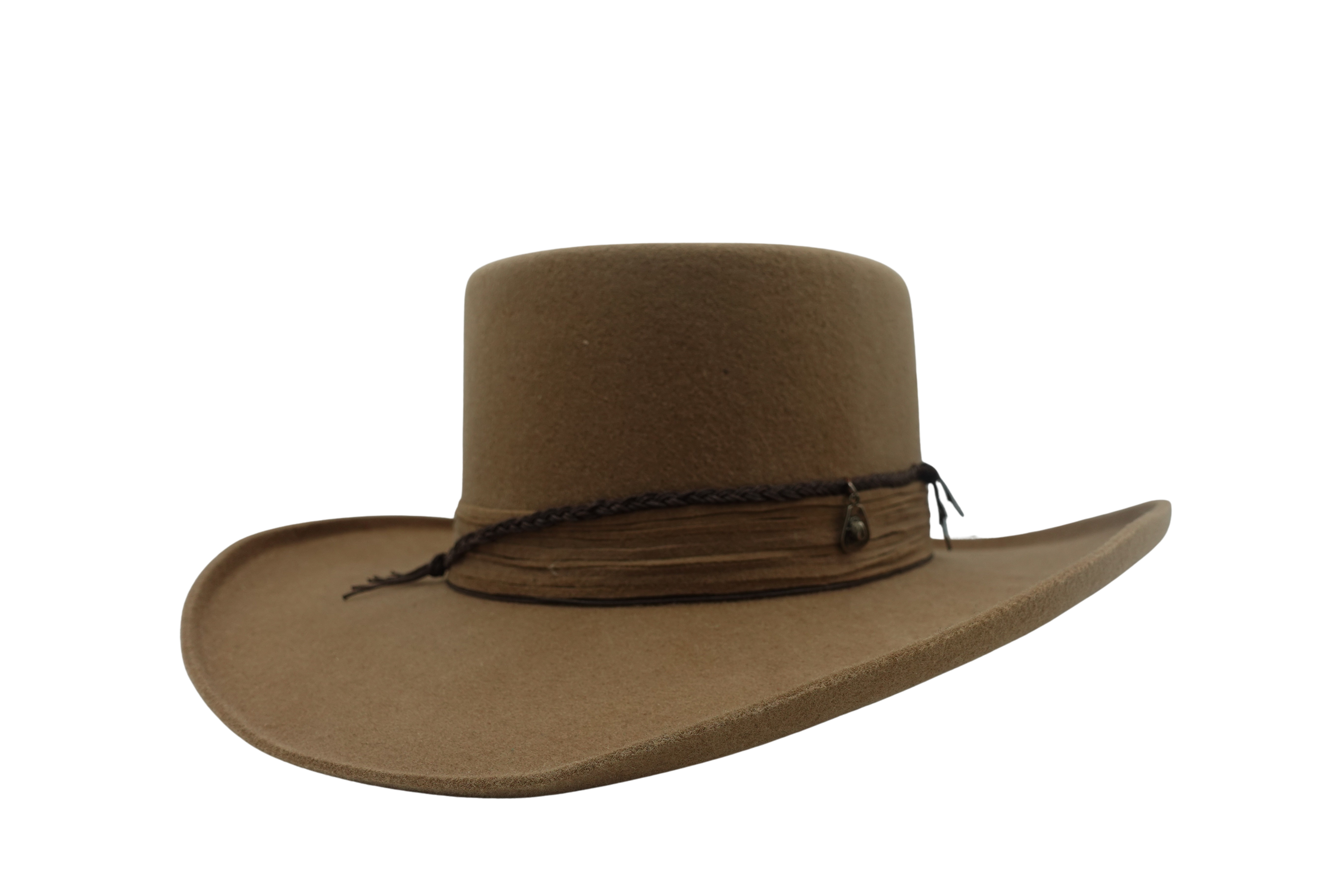 - Hand-blocked bolero felt in pecan, featuring a tonal wrapped leather band with braided detailing